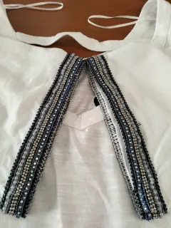 PLAYERA DE ALGODÓN BLANCA. Fresca y bonita playera blanca con aplicaciones de canutillo en mangas y caída de la blusa cuello redondo espalda en V con tira. frente palabra love en relieve de tela