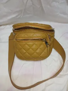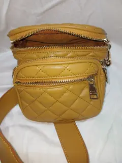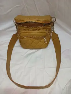Bolsa tipo cangurera para colgar cruzado color mostaza, tiene tres compartimentos con cierre, se encuentra en perfecto estado