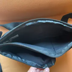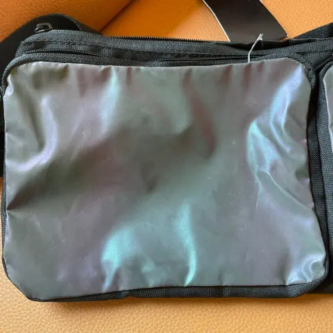 Cangurera negra con bolsillos externos. En color negro y bolsillos tornasol. Con asa para la cintura. Nueva con etiqueta. Sin uso. Mide 32 cm x 17 cm.