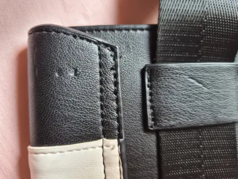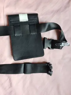 Porta celular tipo cangurera marca Kenneth Cole. Porta celular tipo cangurera color blanco y negro, marca Kenneth Cole. Sin uso, ha estado guardada, solo tiene un detalle en la última foto; en la parte de atrás por arriba del lado derecho tiene un ligero rasguño.