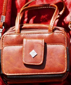 Bolsa color caramelo. Mide 15 cm de ancho, 6cm de largo (profundidad) 10 cm de alto. La correa mide 120cm. De extremo a extremo horizontal son 40 cm de circunferencia.