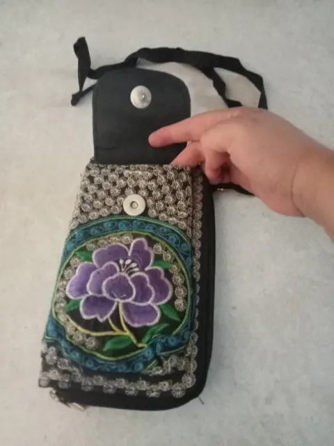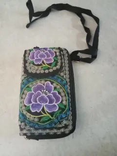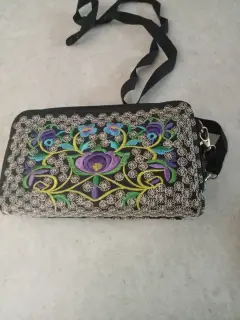Cartera bordada. Hermosa y amplia cartera con diseño floral bordado trae correa y bolsa delantera para el celular