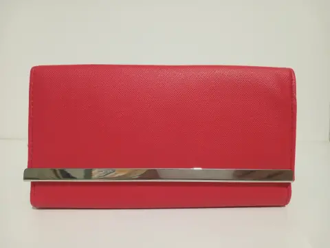 Prácticamente y con espacio para tarjetas y credenciales.Cuenta también con apartado para billetes y monedas.Cierre exterior trasero.Con aplicación metálica en la tapa.Acrílico
