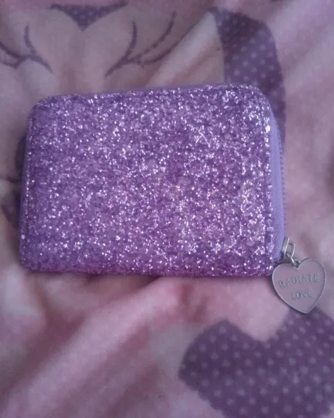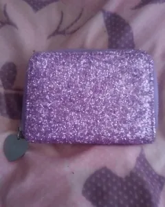 Cartera con glitter. Cartera con gritter, en color lila con espacio para tarjetas, billetes y monedas, es de buen tamaño y tiene un detalle de corazón en el cierre color rosa y con una frase.