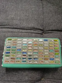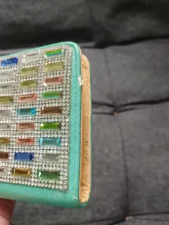 Cartera con piedra. Cartera con piedras color verde agua con beige con unas medidas de 21 cm aproximadamente de ancho y 11 cm aproximadamente de alto tiene cierre interior y separación para tarjetas está un poco dañada de las orillas