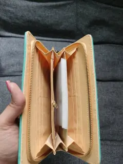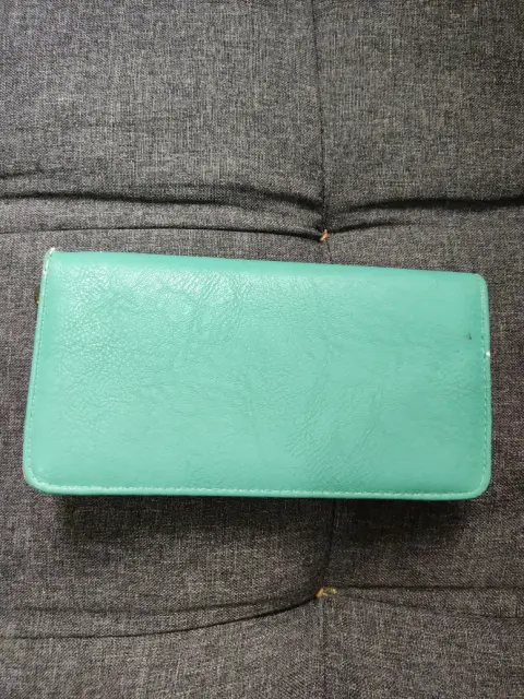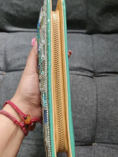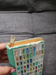 Cartera con piedras color verde agua con beige con unas medidas de 21 cm aproximadamente de ancho y 11 cm aproximadamente de alto tiene cierre interior y separación para tarjetas está un poco dañada de las orillas