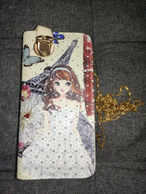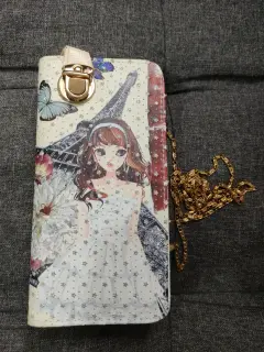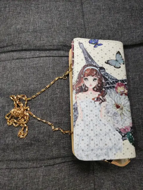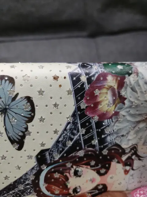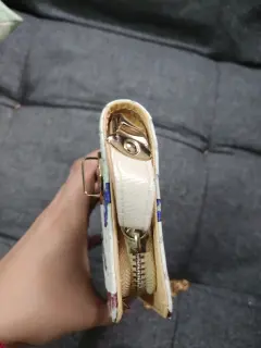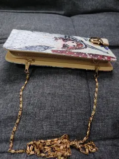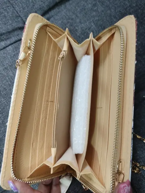 Cartera de brillitos de color beige con dorado contiene cadena de metal para colgarse tiene bronce de seguridad y cierre metálico y en el interior tiene un compartimiento con cierre para las monedas y otros compartimientos para tarjetas de crédito las medidas son 21 cm aproximadamente de largo y 11 cm aproximadamente de altoEl único detalle que tiene es la estrella pintada cómo está en la imagen