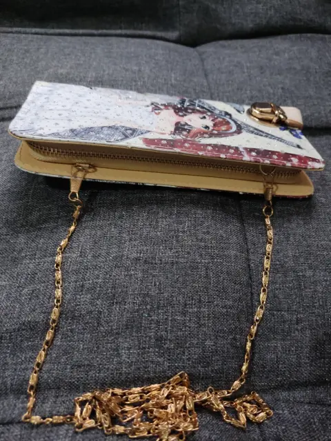 Cartera de brillitos. Cartera de brillitos de color beige con dorado contiene cadena de metal para colgarse tiene bronce de seguridad y cierre metálico y en el interior tiene un compartimiento con cierre para las monedas y otros compartimientos para tarjetas de crédito las medidas son 21 cm aproximadamente de largo y 11 cm aproximadamente de altoEl único detalle que tiene es la estrella pintada cómo está en la imagen