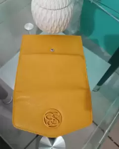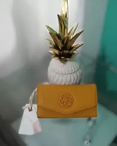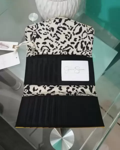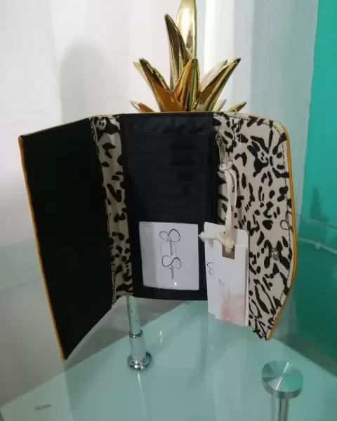 Cartera Jessica Simpson color mostaza, cuenta con 13 compartimentos para tarjetas, 2 compartimentos para billetes y 1 compartimento para monedas con cremallera.Sus dimensiones17 cm x 10 cm