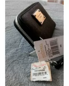 Cartera muñequera Michael Kors Est. 1981 en color negra, con monograma, cierre y placa en color plata, 9 cm de alto y 14 de largo