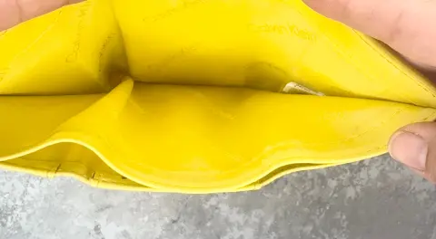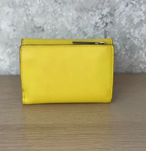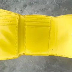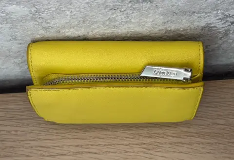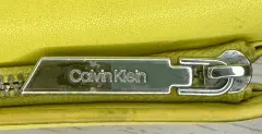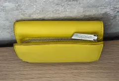Hermosa, tierna y práctica Cartera monedero Calvin Klein amarilla. Doble plegado, 8 espacios para tarjetas o credenciales, espacio para billetes y monedero en la parte trasera.Presenta raspuduritas y poco de desgaste en los pliegues visibles en las fotografías.Medidas: 9 cm altura, 12 cm largo y profundidad 4 cm