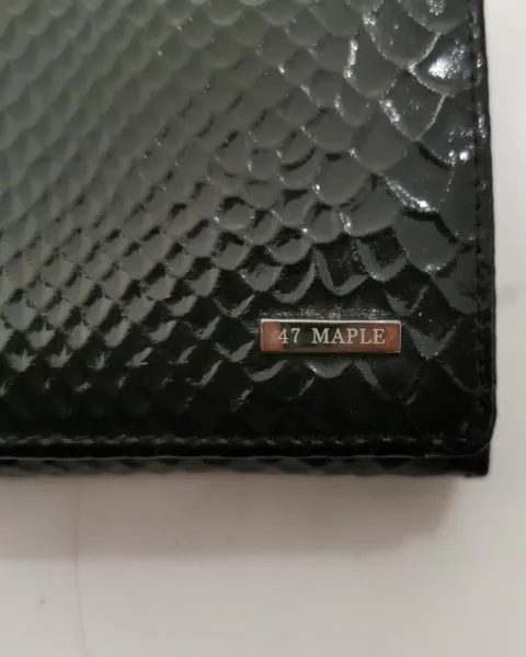 Cartera negra 47 Maple. Cartera negra, exterior acabado charol sintético imitación piel de víbora, interior sintético tipo piel. Del lado del botón tiene compartimentos para tarjetas y bolsillos, uno con siper. Del otro lado tiene un bolsillo con separación. 18.5 cm de largo, 9 cm de alto, 3 cm de ancho, cerrada.