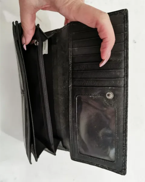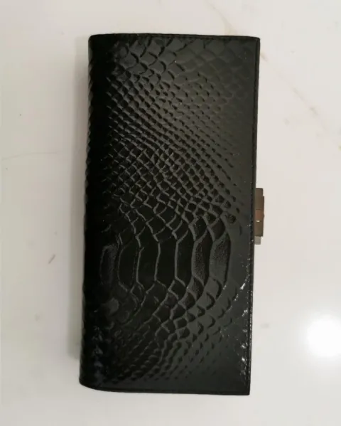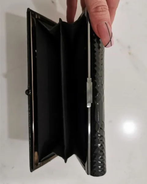 Cartera negra, exterior acabado charol sintético imitación piel de víbora, interior sintético tipo piel. Del lado del botón tiene compartimentos para tarjetas y bolsillos, uno con siper. Del otro lado tiene un bolsillo con separación. 18.5 cm de largo, 9 cm de alto, 3 cm de ancho, cerrada.