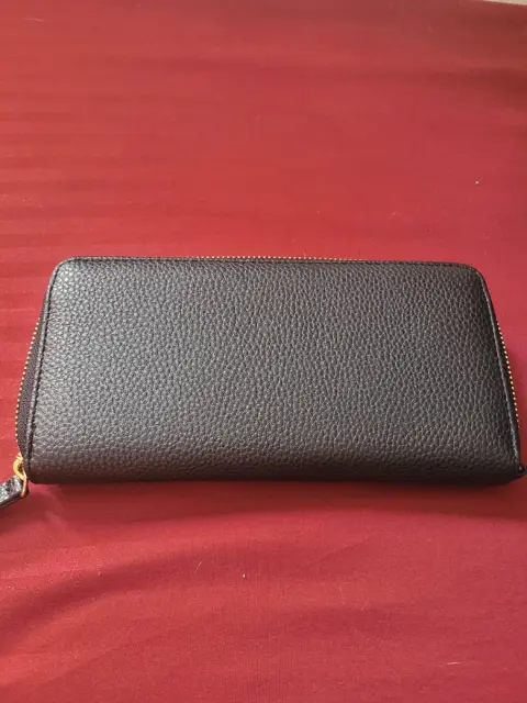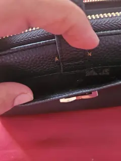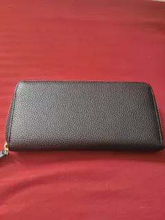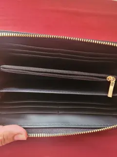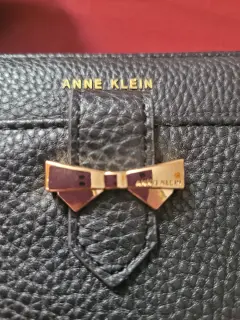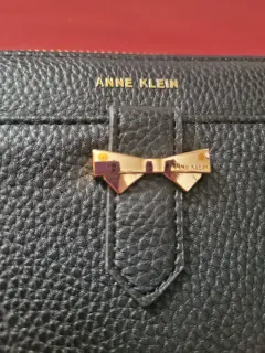 Bonita cartera grande de la marca Ann Klein, con cierre y un bello detalle de moño en el centro de la cartera. Trae compartimento para tarjetas