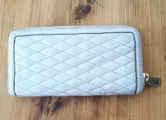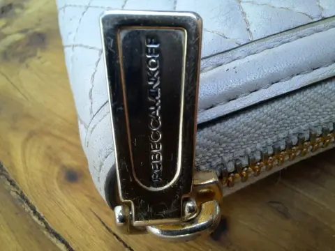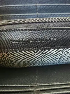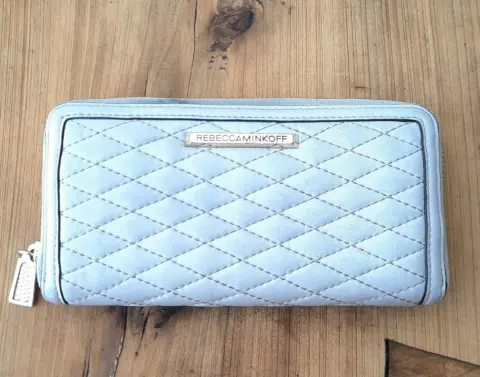 Cartera Rebecca Minkoff. Cartera de piel acolchada con zipper alrededor, tiene compartimentos para 8 tarjetas, billetes y monedas (en el compartimento de monedas le hace falta la jaladera del zipper, en la última foto se aprecia).Usada con signos normales.