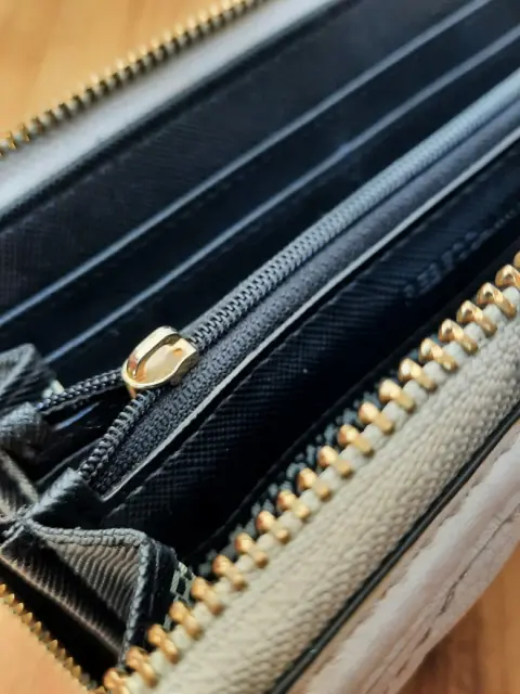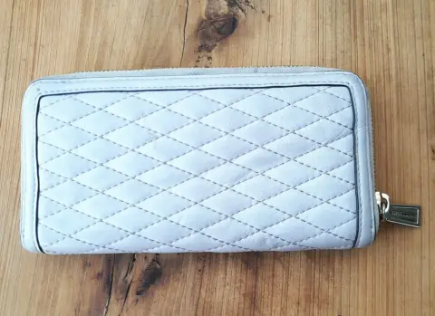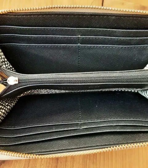 Cartera de piel acolchada con zipper alrededor, tiene compartimentos para 8 tarjetas, billetes y monedas (en el compartimento de monedas le hace falta la jaladera del zipper, en la última foto se aprecia).Usada con signos normales.