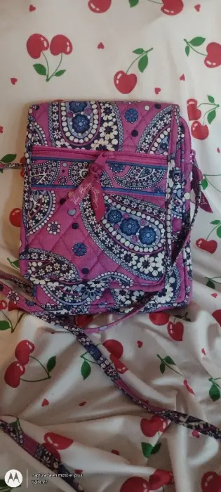 Cartera rosa con asa para cruzar. Bolsito bandolera rosa paisley tiene un bolsillo central, un espacio para tarjeta, un bolsillo con cierre en la tapa y un bolsillo posterior