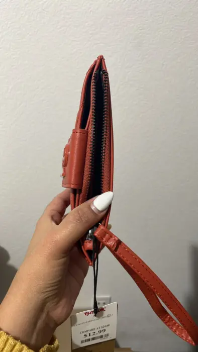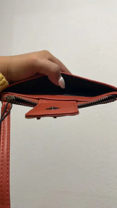 Hermosa y súper útil! 2 bolsas, 1 con cierre y otra con botón de contacto con el logo de la marca, tiene strap de muñeca removible.✨Disponible en negro y ocre