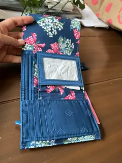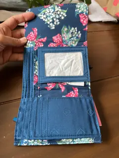 Hermosa billetera marca Vera Bradley. Material Tela lo cual la hace muuuuuy duradera. Varios compartimentos y cierre para monedas.