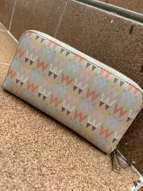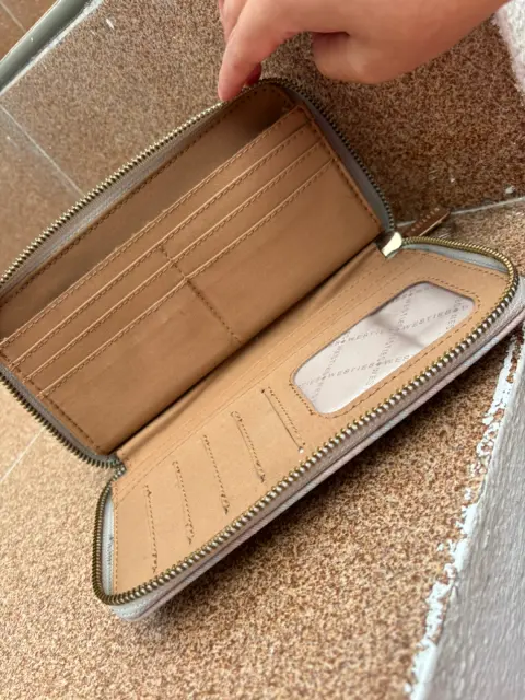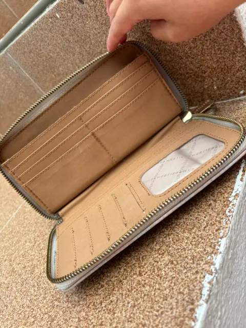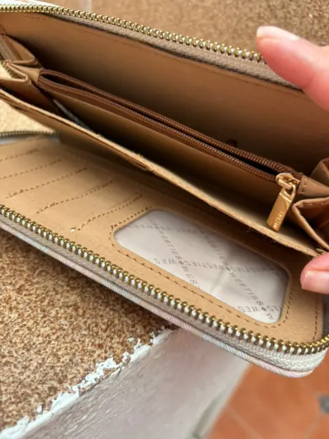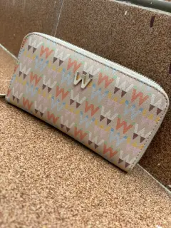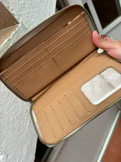 Carta Beige (usada) para tarjetas, compartimentos de monedas y billetes (amplia) Puedes meter tus llaves y/o el celular en excelente estado.Marca: WestiesMedidas: 22 cms de largo y 11 cms de alto