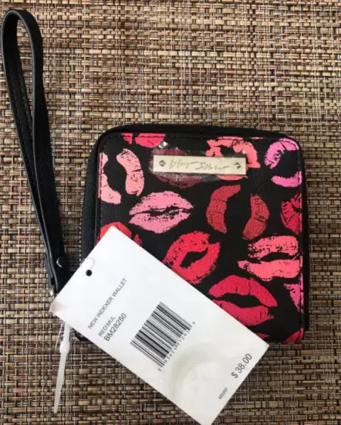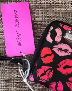 Tarjetero Betsey Johnson, espacio para hasta 6 tarjetas y monedas, con asa para colgarse en la mano y para colocarse en la mochila o bolso. Diseño de besitos, con etiqueta ¡estrénala!