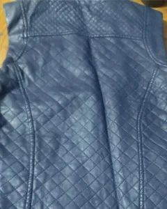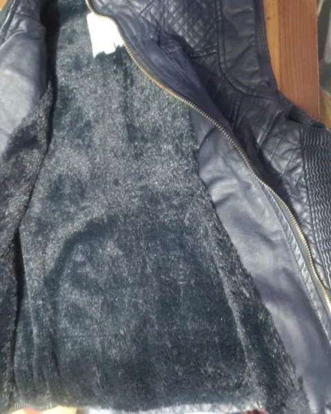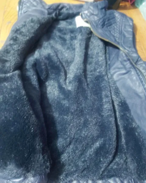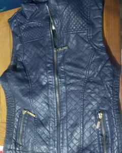 Chaleco azul marino tipo piel es de talla s ch muy suave afectada con cierres en sus volsillos los cierres si le sirven el estilo de rombitos muy coqueton