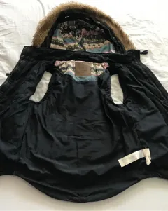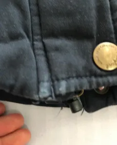 Es un chaleco color azul marino con peluche en el gorro, ese peluche se desmonta, es talla ECH, tiene detalles de uso como se muestran en la foto.