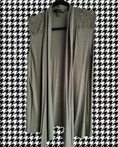 Chaleco color verde militar, con estoperoles, en muy buen estado, talla L pero queda muy bien en M o XL por el tipo de tela, los estoperoles están en buenas condiciones, la tela es muy fresca y el color combina con todo.