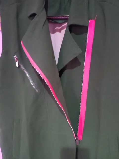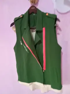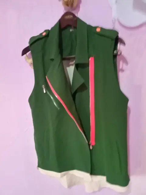 Chaleco dama, verde militar con vivos rosa neón, cierres y beige, muy bonito y original, talla G.