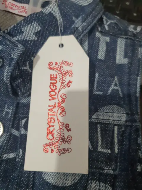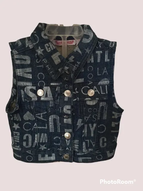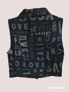 Chaleco de mezclilla talla 4. Marca Crystal Vogue. Estampado de letras en blanco.