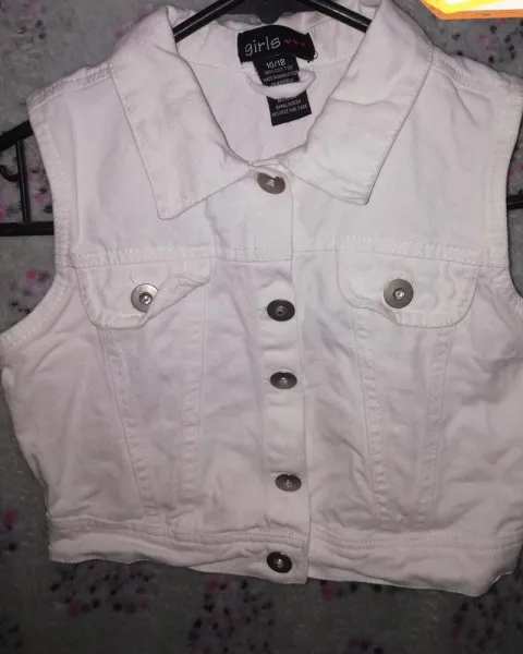 Chaleco blanco de mezclilla para niña... Talla 10-12... Solo se usó en tres ocasiones x un breve momento... Buen estado... Falta planchar, antes de enviar será planchado