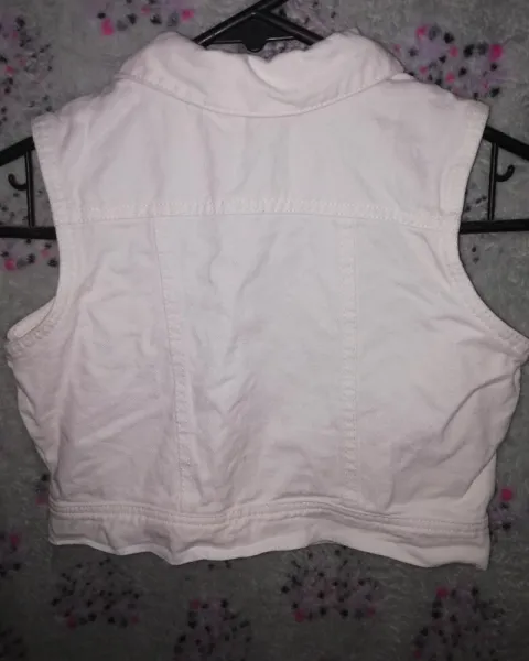 Chaleco de mezclilla blanco. Chaleco blanco de mezclilla para niña... Talla 10-12... Solo se usó en tres ocasiones x un breve momento... Buen estado... Falta planchar, antes de enviar será planchado