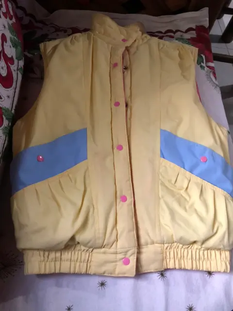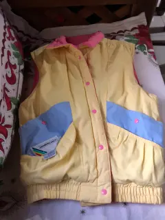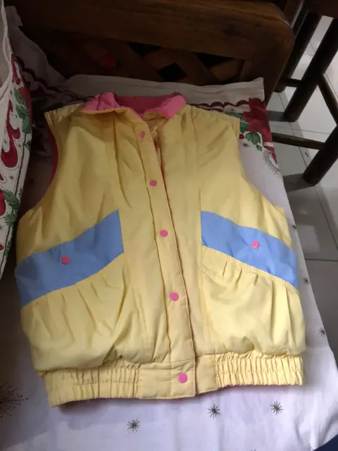 Chaleco Marca Members Only, doble vista, con broches, Talla 14 y alegres colores (Amarillo y Rosa).. Resorte a la cintura.