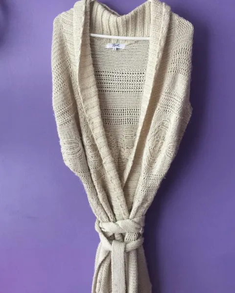 Chaleco tejido, es bastante caliente y el largo, le queda a talla M pero si viene bastante largo, esta en perfectas condiciones y se ve muy bonito