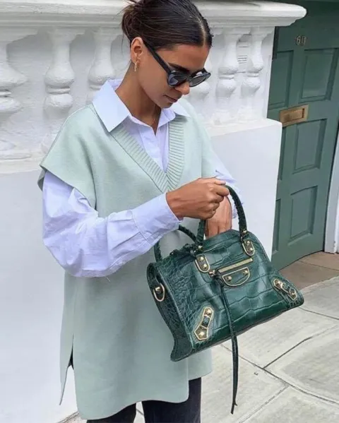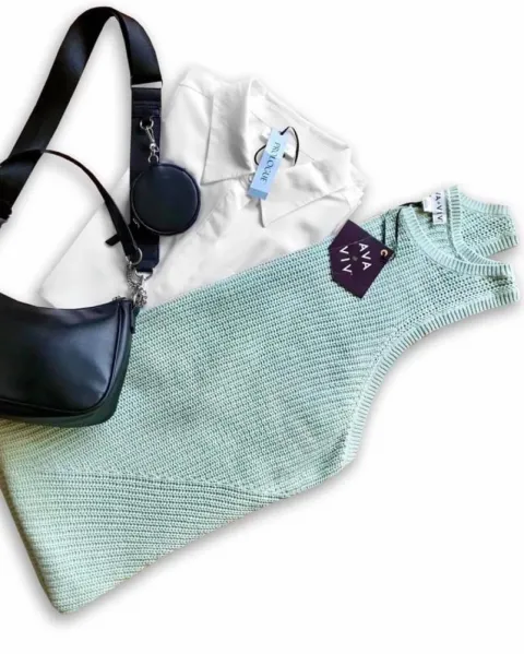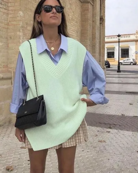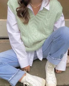 Chaleco de punto color menta marca AVA VIV, llega a la cadera más o menos. Es unitalla así que a cualquiera le va súper bien