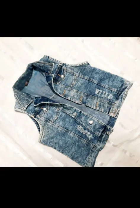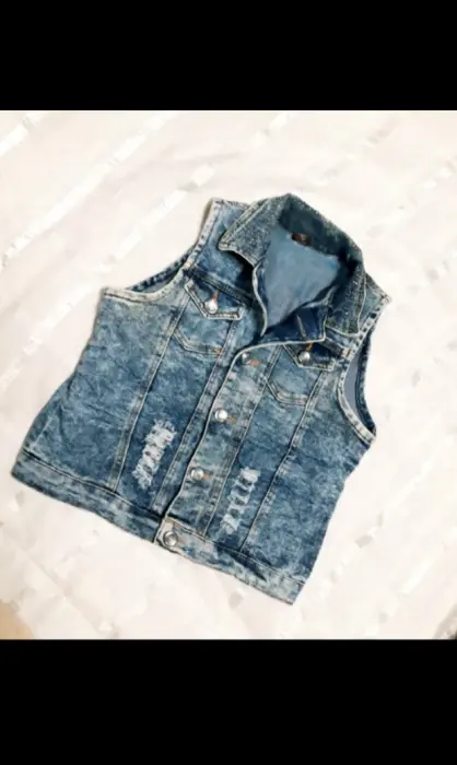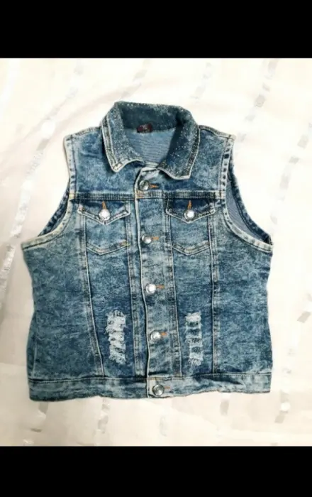 Chaleco mezclilla. Chaleco con botones de cristal y detalles de piedritas de cristal en el cuello, luce super lindo, se uso solo un par de veces, dice ralla M viene reducido para S