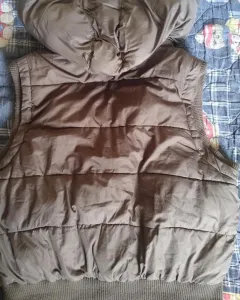 Chaleco con gorrito, orilla del gorro con peluchito, bolsas al frente, se abrocha con cierre, el gorrito se puede quitar. Color verde militar