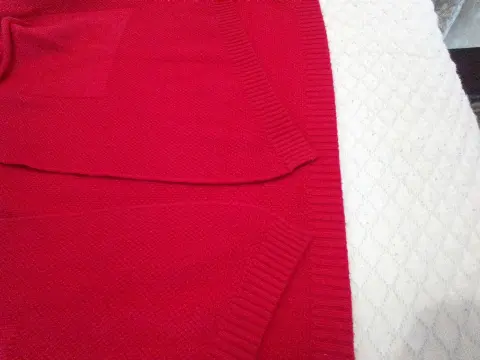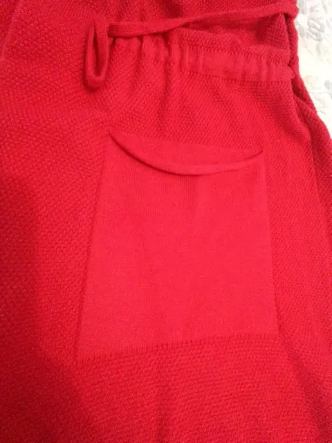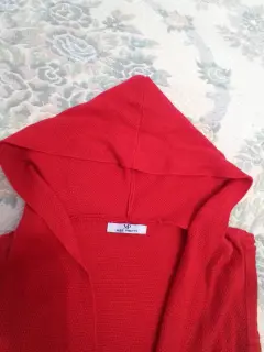 Versátil y lindo chaleco color Rojo quemado, con gorro y cinta de ajuste en la cintura. Tejido, no de tela. Tiene bolsas al frente. Unitalla. Nuevo sin etiqueta
