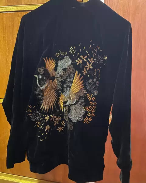 Bomber terciopelo con bordado. Bomber casi nueva muy bonita tiene cierre y bolsas da para una talla G . En la espalda bordado dorado y plata .