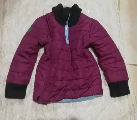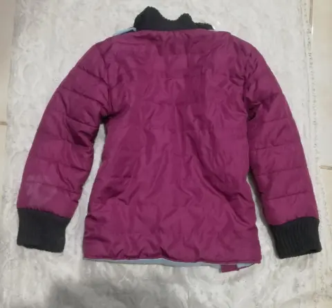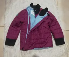Chamarra calientita y super linda para nena talla 5-6 años. Color morado y azul por dentro con el cierre de lado.