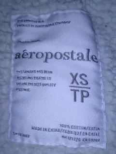 Cazadora Aéropostale T-XS. Cazadora Aéropostale T-XS en perfectas condiciones, el color es entre verde y gris (tono caqui). La capucha no es desmontable y le hace falta su peluche a la misma, trae dos bolsas laterales y dos frontales pequeñas todas cierran con botón que trae el nombre de la marca. Trae un cordón interno a la altura de la cintura para ajustar, la tela es como tipo gabardina y trae forro aborregado