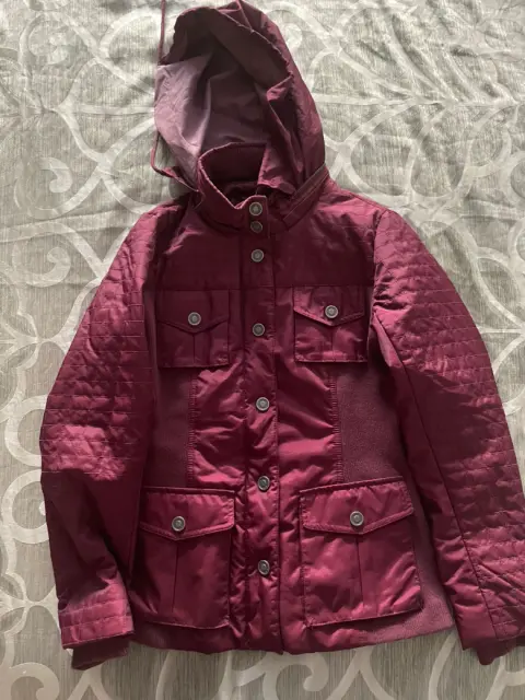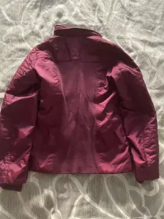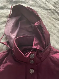 Cazadora impermeable con gorro. Linda chamarra color vino con tela tipo resorte en los lados y la parte de atrás para ajustar la figura, en frente y mangas tela impermeable, bolsas frontales, con gorro el cual se puede ocultar en la parte del cuello que tiene un compartimiento