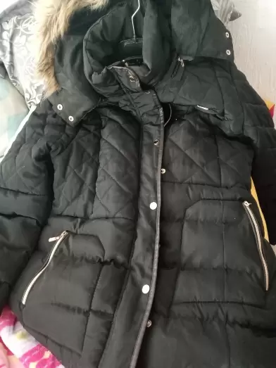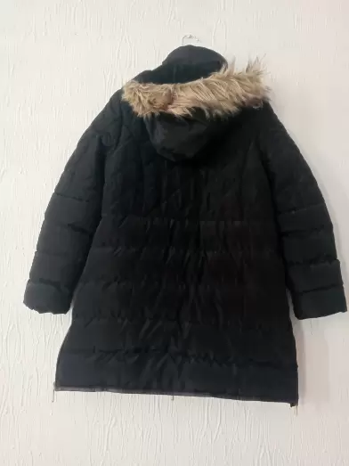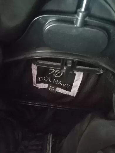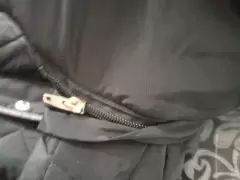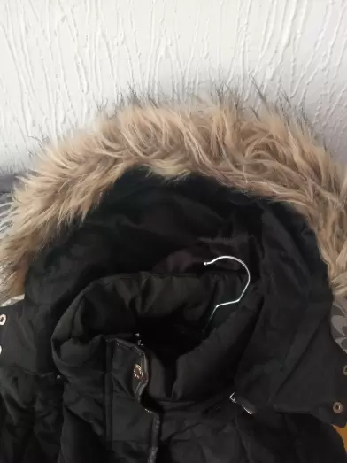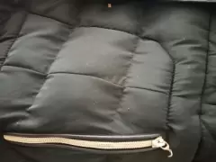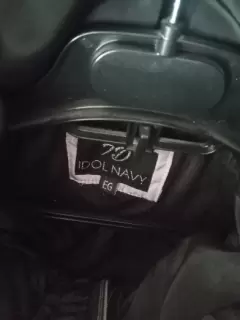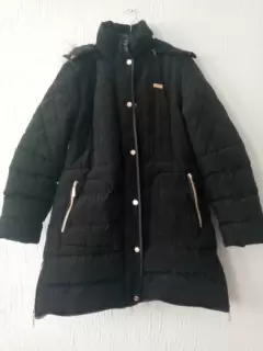 Chamarra cazadora negra detalle en cierre de bolsillo izquierdo, tiene gorro desmontable con forro en el interior y cierres en los laterales para ajuste en caderas.Largo 78 cm Queda a talla grande.