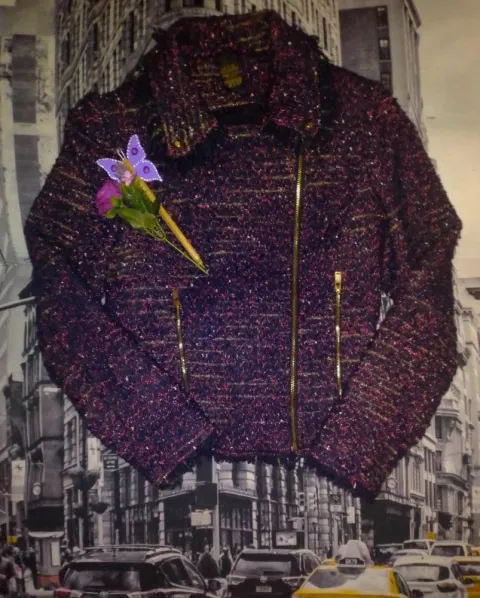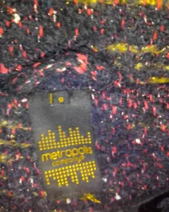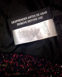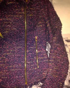 Hermosa Cazadora tweed tipo Chanel en perfecto estado , marca Metropolis , talla Ch y M hastq podria quedar a una grande , ayuda a acinturar por el cierre que es en diagonal , cuenta con su forro por dentro y tiene unos coquetos flecos o barbillas en las mangas y en el cuello , es color dorado, rojo , negro y blanco, muy combinable.