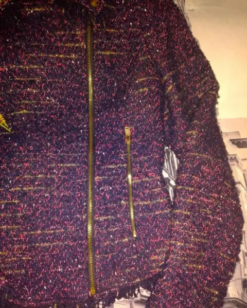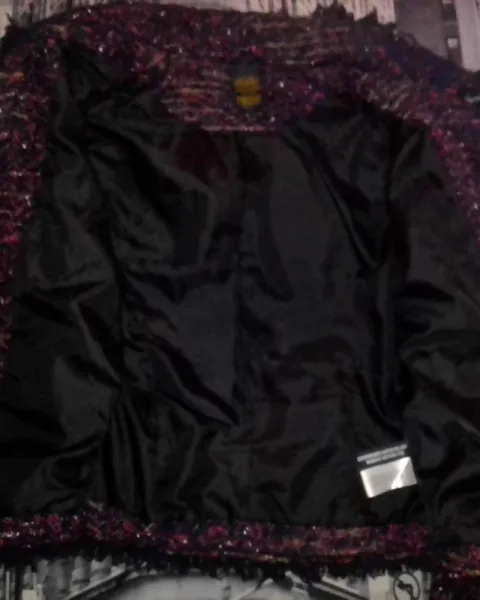 Cazadora Tweed Destellos Dorados. Hermosa Cazadora tweed tipo Chanel en perfecto estado , marca Metropolis , talla Ch y M hastq podria quedar a una grande , ayuda a acinturar por el cierre que es en diagonal , cuenta con su forro por dentro y tiene unos coquetos flecos o barbillas en las mangas y en el cuello , es color dorado, rojo , negro y blanco, muy combinable.