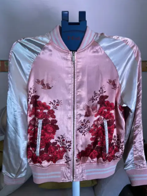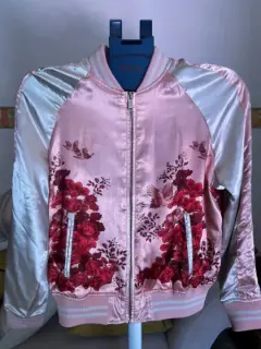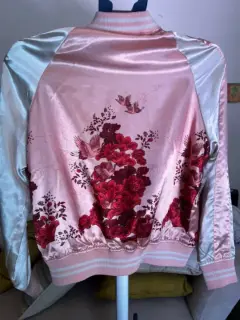 Chamarra. Chamarra tipo bomber color rosa y mangas beige estampado de flores y pájaros