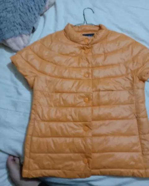 Chamarra de manga corta, color anaranjado tenue está calientita. Talla chica.