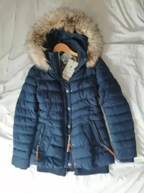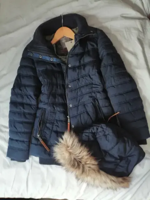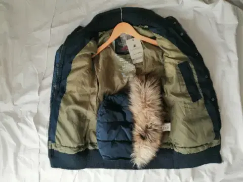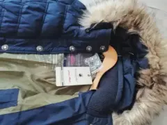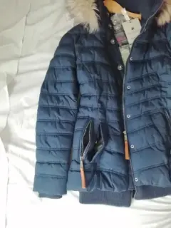 Chamarra azul con gorro desmontableBolsa interior y dos bolsas exterioresNueva con etiquetaLarga, te cubre hasta los glúteos