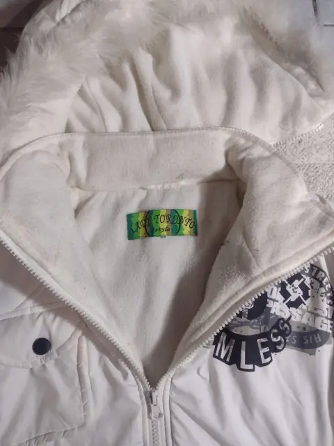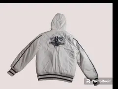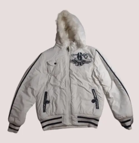 Chamarra blanca de dama. Chamarra blanca con franjas negras, forro por dentro del mismo color, bolsas en laterales y gorro con peluche