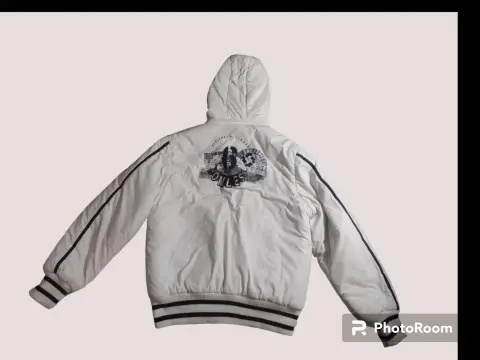 Chamarra blanca con franjas negras, forro por dentro del mismo color, bolsas en laterales y gorro con peluche